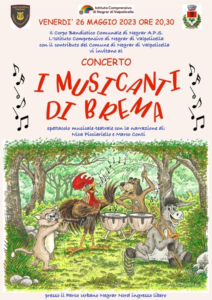 Spettacolo musicale-teatrale ‘I Musicanti di Brema’ presso il Parco Urbano Nord di Negrar in via Cavalieri di Vittorio Veneto-giorno 26 maggio 2023 ore 20.30. A conclusione del progetto nato dalla collaborazione tra il Corpo bandistico comunale di Negrar APS e questo Istituto Comprensivo, con il contributo del Comune di Negrar di Valpolicella, sarà messa in scena una…