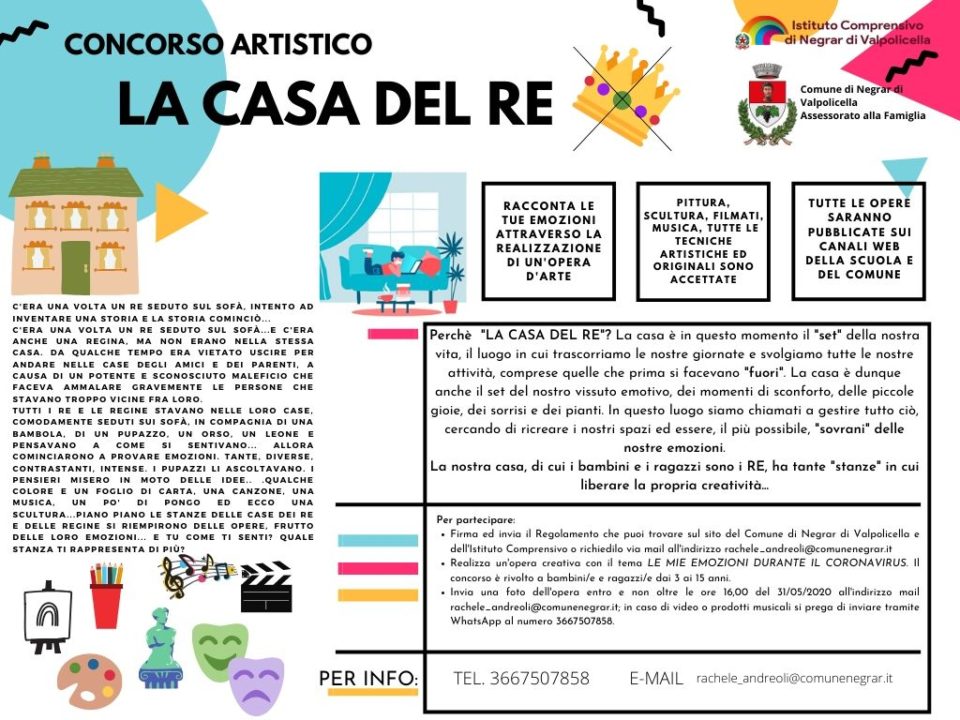 L’assessorato alla Famiglia del Comune di Negrar di Valpolicella, in collaborazione con l’Istituto Comprensivo, ha indetto un concorso artistico intitolato “La casa del re”. Lo scopo è quello di realizzare un’opera creativa sul tema: Le mie emozioni durante il Coronavirus. Si allega la circolare n. 186, il regolamento del concorso e il flyer.